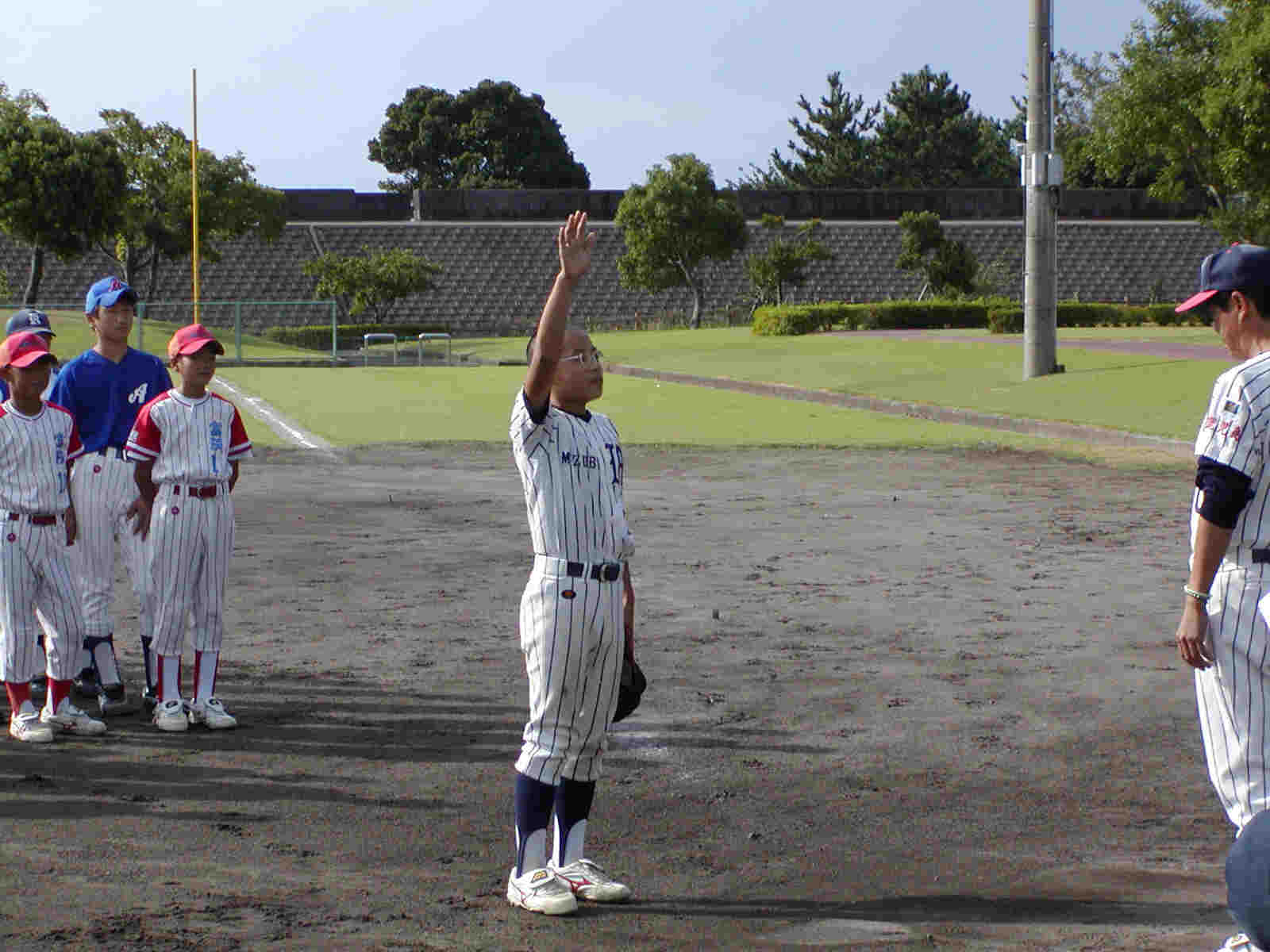 | 選手宣誓は溝辺の泰洋主将 | 北部は神宮のバッテリーをはじめ吉松の竹中選手 など170センチ近いクリーンアップがずらりと続く |