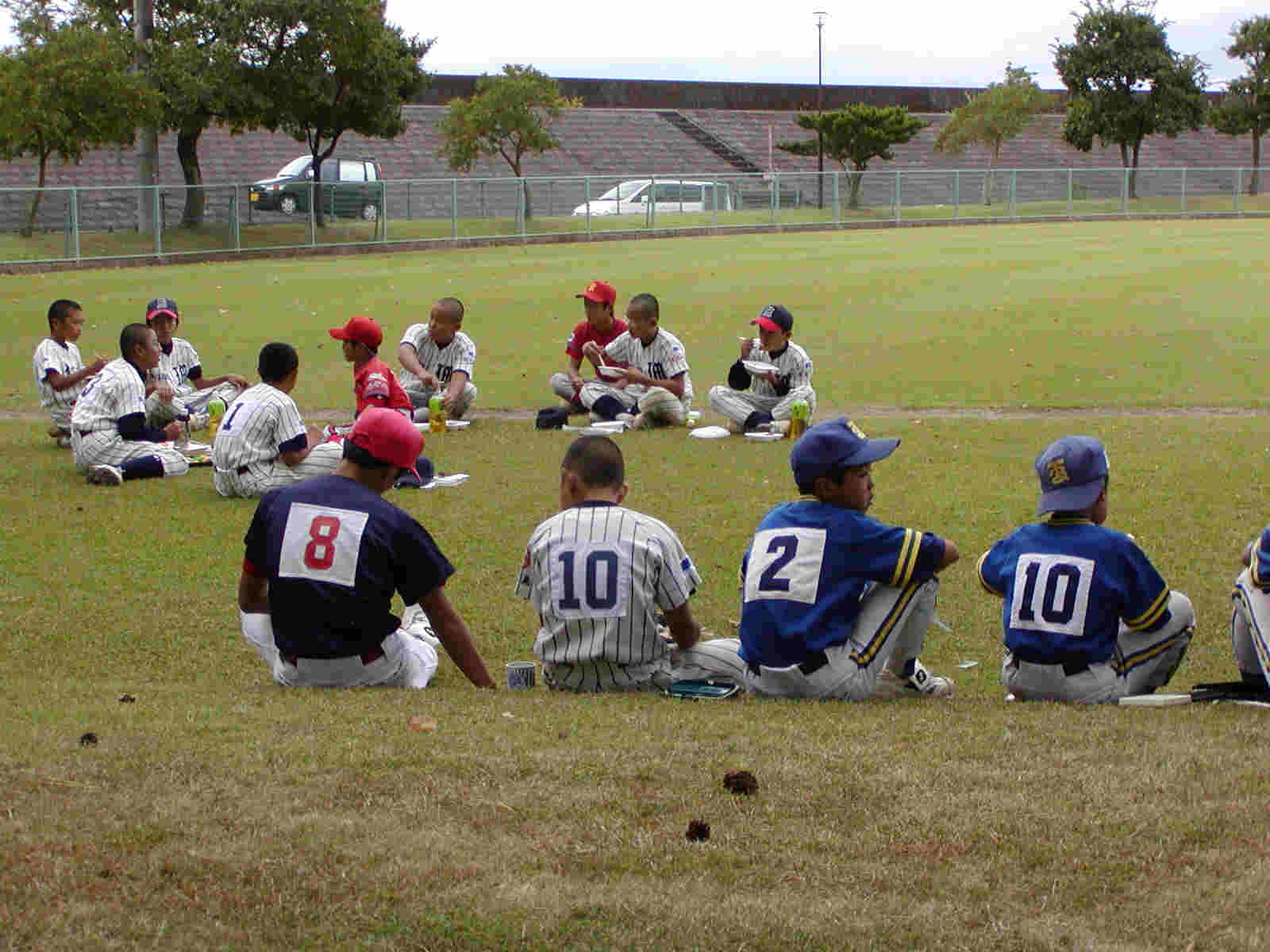 | 皆で弁当を広げソフト談義に花が咲く | 北部ほど大きな選手はいないが柁城、溝辺、陵南、 姶良などつわものぞろいの西部チーム 名将いわく 「このメンバーなら全国大会優勝も夢じゃない」 |